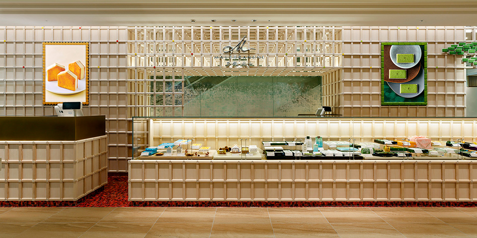 - シェフクッキーの原点であるマールブランシュ北山本店の“家型”のモチーフが随所に見え隠れし、木のぬくもりを感じる伝統的な木組み技術で店内を構成。赤のモザイクタイルと「茶の菓」オブジェが印象的に彩ります。京都髙島屋店でしか購入できない「シェフクッキーサンド」をはじめとする、日常に寄り添うおやつ菓子から贈り物に最適な詰め合わせまで揃えております。